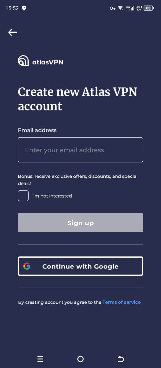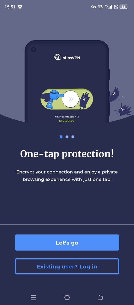 При первичном запуске Atlas VPN попросит вас предоставить разрешения на доступ к сети — далее вы попадёте на первичный экран входа. Нажмите Let`s Go для продолжения работы в приложении.