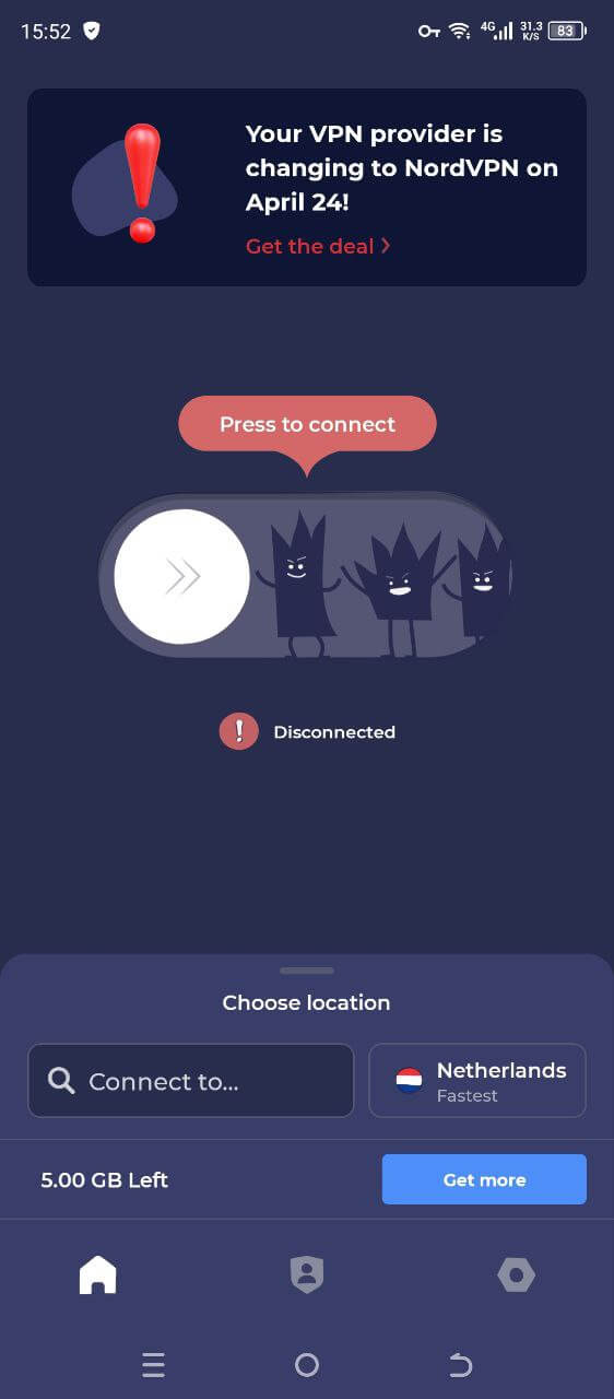 После успешного входа вы обнаружите главный экран приложения. Здесь будет предложено выбрать один из серверов ниже (в нижней части приложения), после чего нажать на большой ползунок по центру. Приложение окрасится в зелёный цвет, а ползунок станет более ярким. Выключить Atlas VPN допускается повторным нажатием на ползунок.