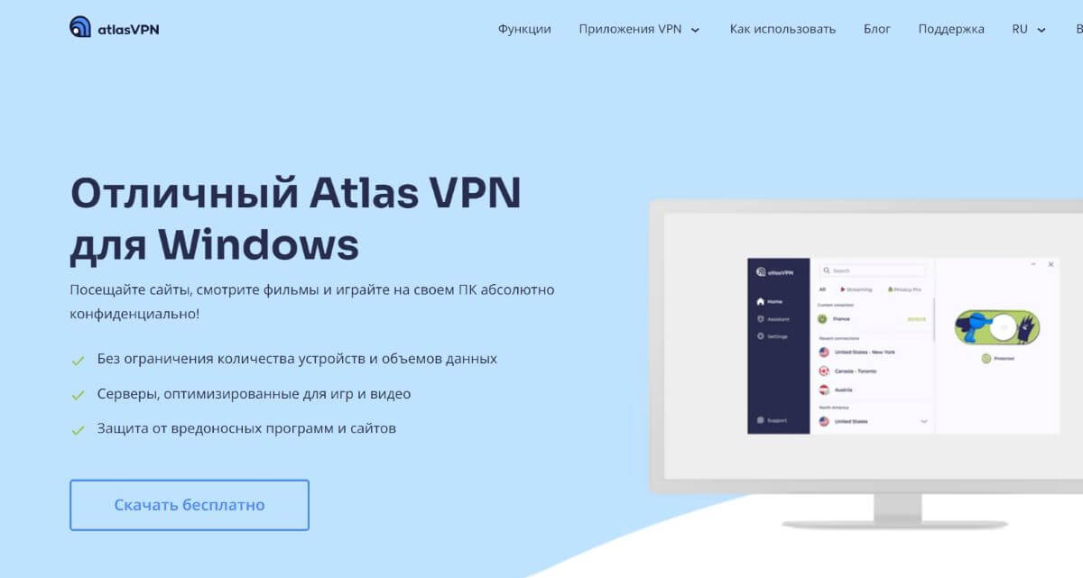 Для установки AtlasVPN на десктоп необходимо перейти на сайт atlasvpn.in и в верхнем меню в пункте “Приложения VPN” выбрать целевой вариант.