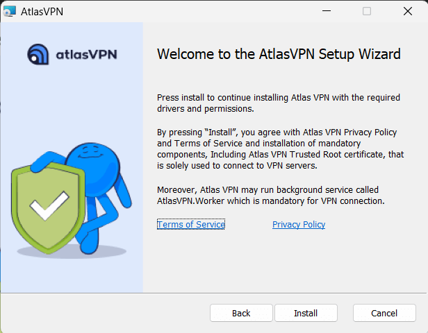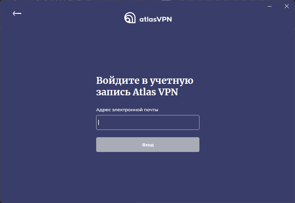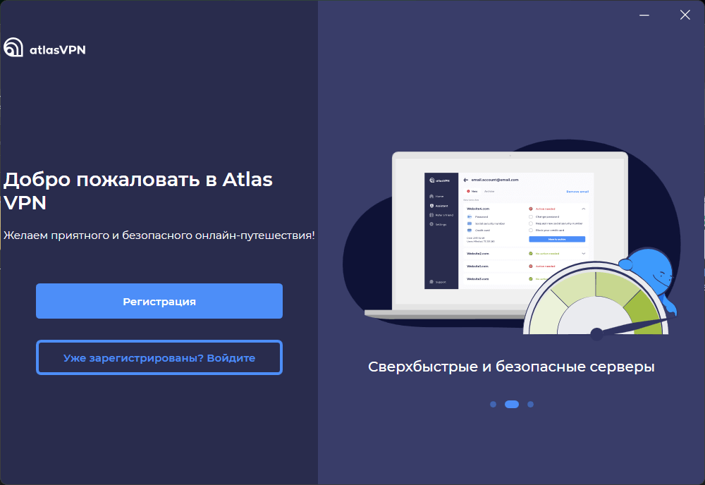 Инсталлятор автоматически закроется и на рабочем столе появится иконка Atlas VPN. Здесь будет предложено либо зайти в уже имеющуюся учётную запись, либо зарегистрироваться в системе.