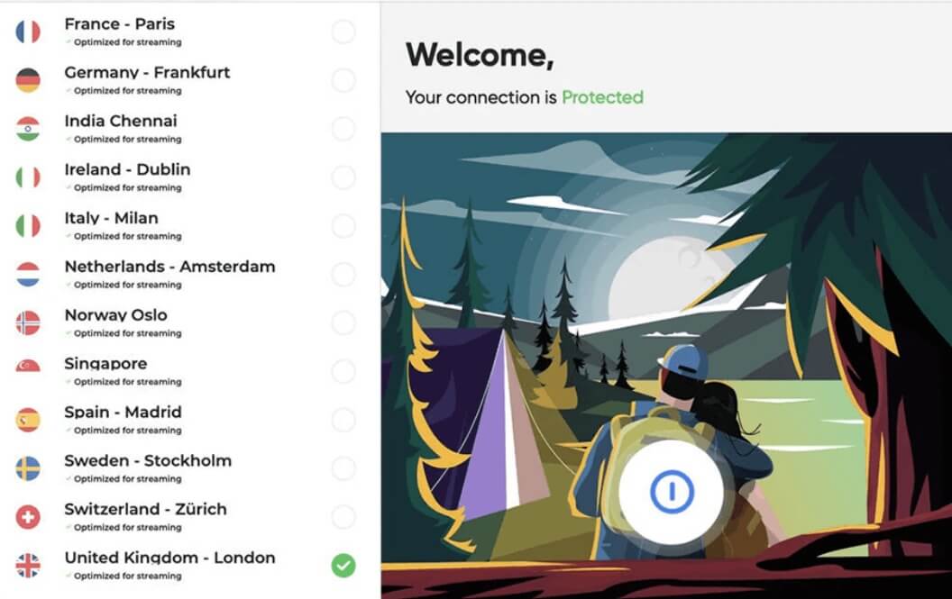 Подтвердите вход, откроется главное окно приложения. Вручную выберите нужный сервер и нажмите на кнопку включения на главном поле справа. ЕВы получите уведомление о подключении к сети Atlas VPN.